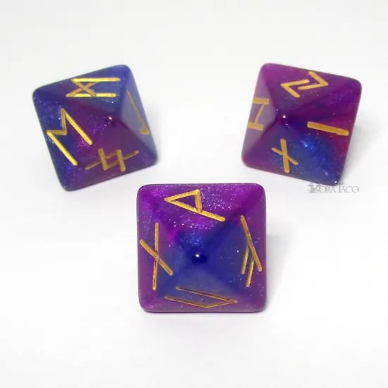 占いに使用できるルーン文字24個を8面体3個に記載したダイスセットです。