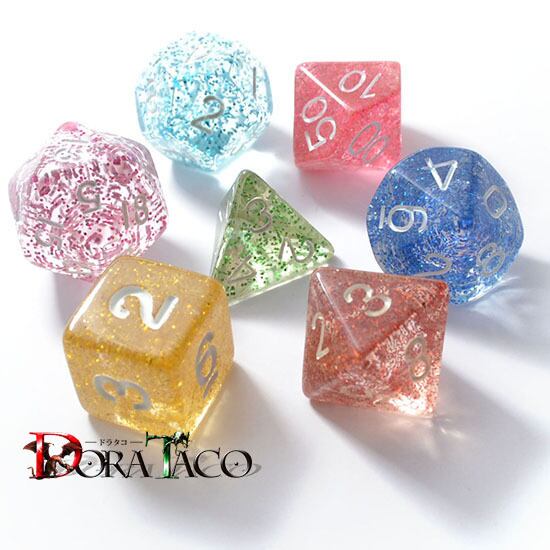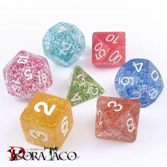 7種の多面体に7色の色を割り当てたカラフルなラメ入りダイスセットです。