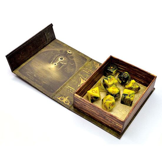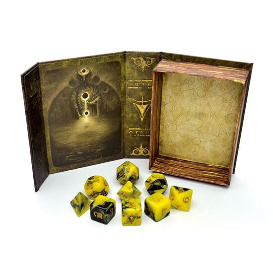 禁忌の書ボックスに7種9個のサイコロが入ったダイスセット。