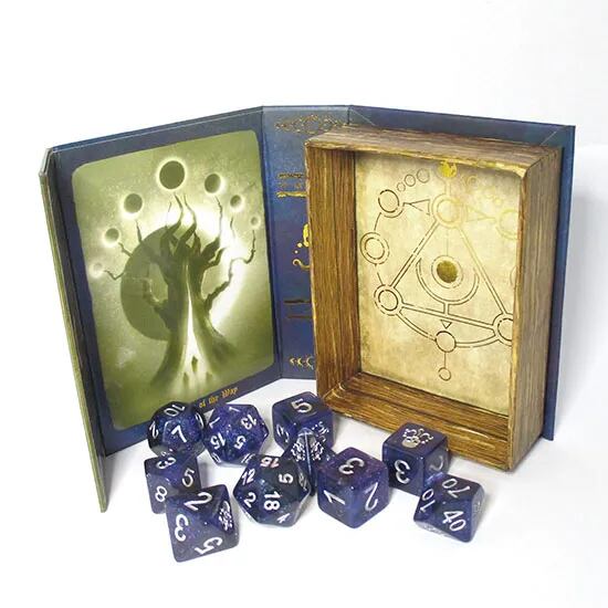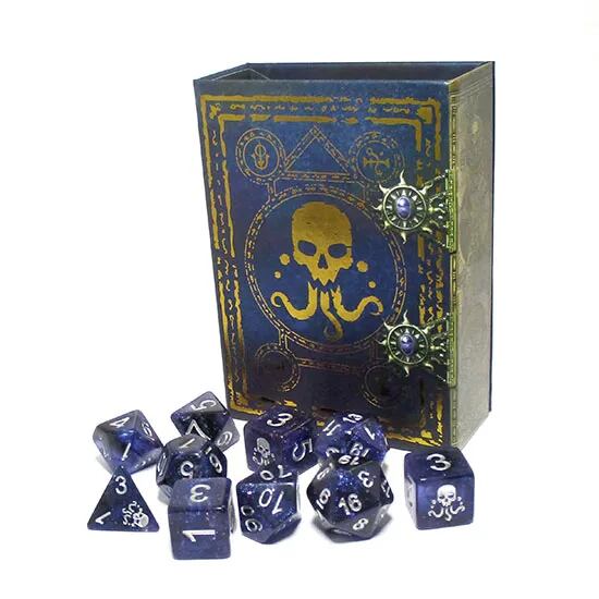 ファンタジーやホラーを演出する魔道書ボックスに7種9個のサイコロが入ったダイスセット。