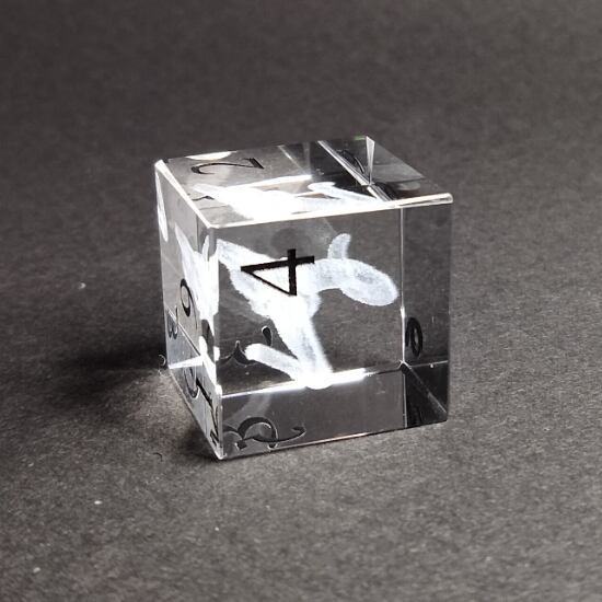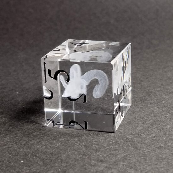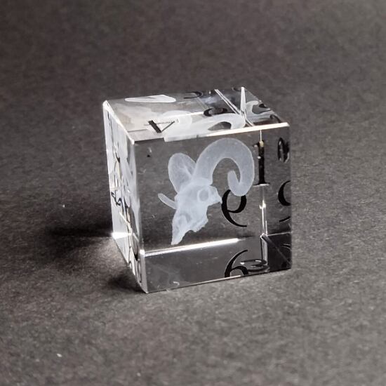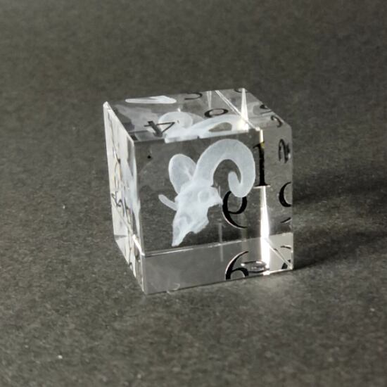 レーザーを使ってガラス内部に【ヤギの頭蓋骨】を描いた16mm6面サイコロです。