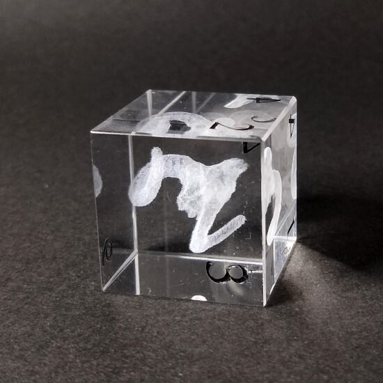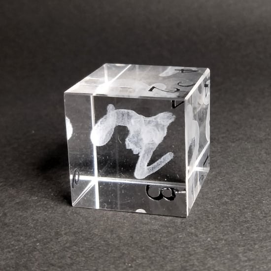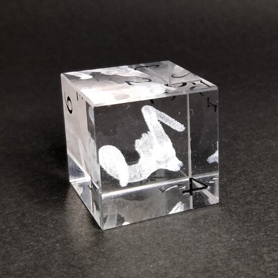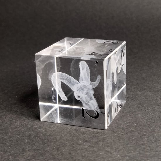 レーザーを使ってガラス内部に【ヤギの頭蓋骨】を描いた20mm6面サイコロです。