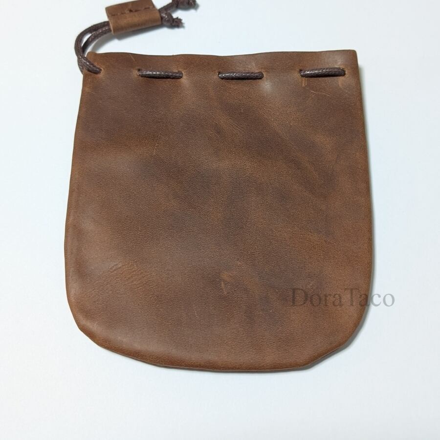 ドラタコオリジナルデザインの巾着袋、本革製なので使っていくとエイジングを楽しめます。