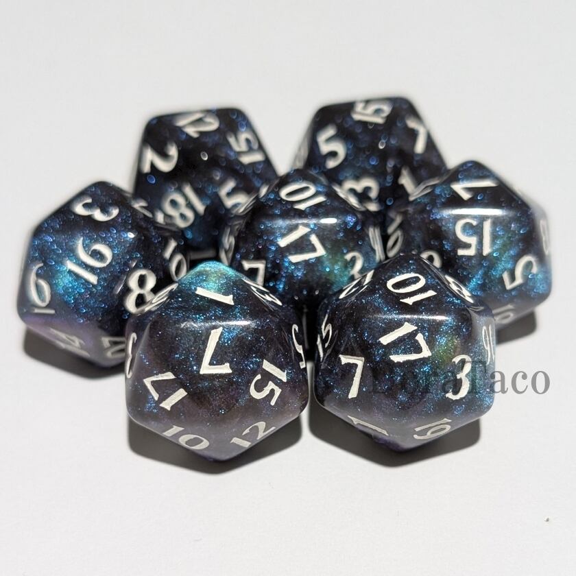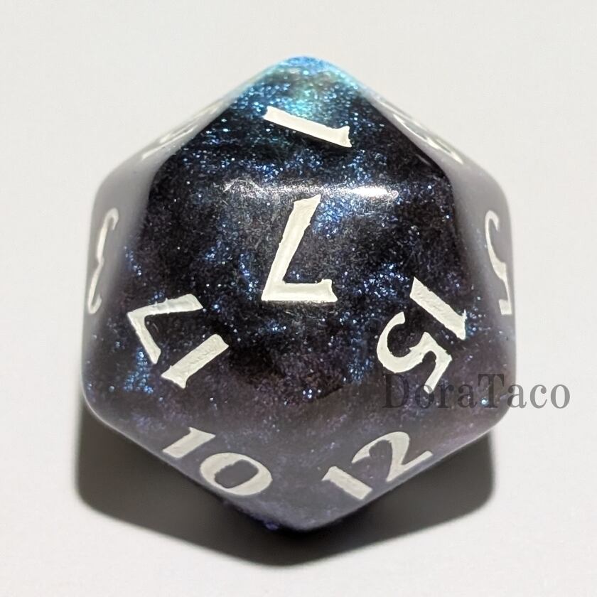 宇宙を連想させる微細なラメの入った美しい20面体ダイス。