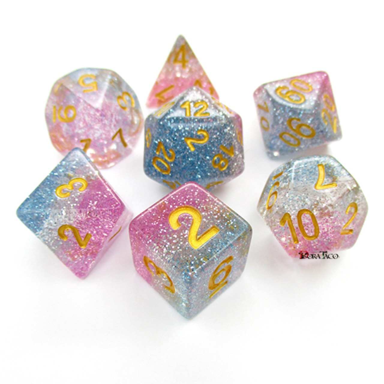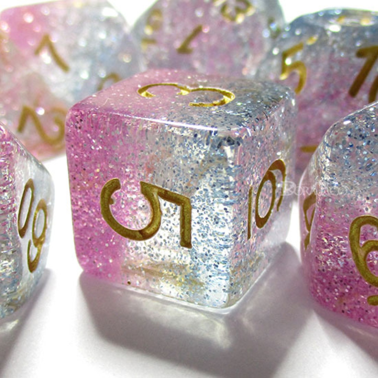 大量に入ったラメが光を反射しまくる多面体ダイスセット。