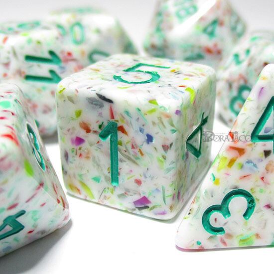 白い樹脂にカラフルな破片が沢山入っているダイスセットです。