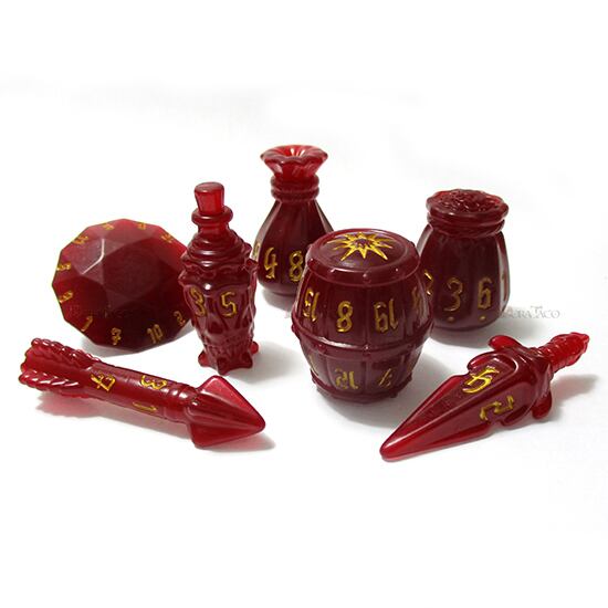 内容/D4ダガー、D6毒入りポーション、D8弓矢、D10報酬袋、テンズ報酬袋、D12ジェム、D20樽×各1個