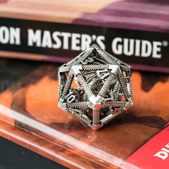 内部にドラゴンを封印した金属製の20面ダイスです。