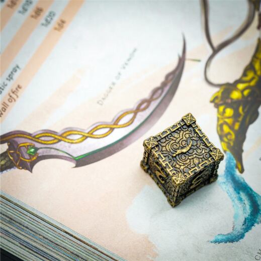 中世をイメージした本体デザインに毒塗りダガーをイメージした数字、縁までデザインされた金属製ダイスセットです。