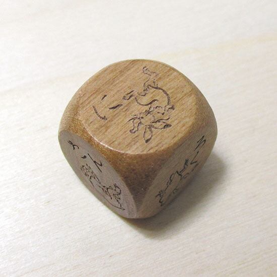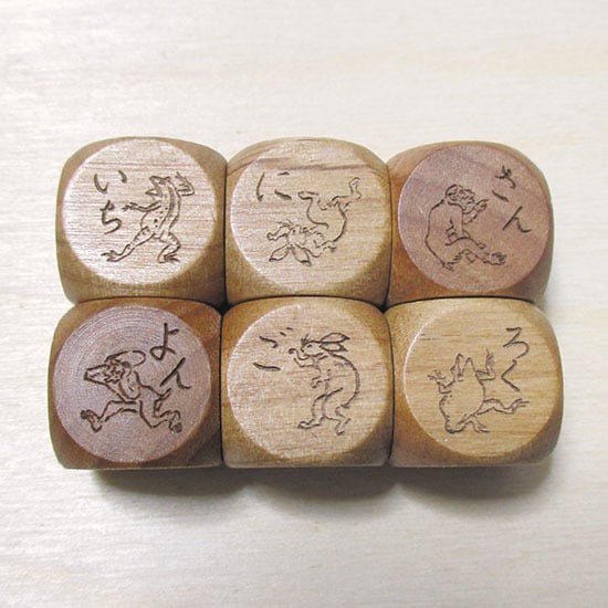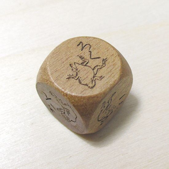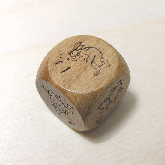 漫画の始祖「鳥獣戯画」の甲巻に登場する兎・猿・蛙をあしらった木製6面サイコロ。
