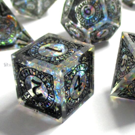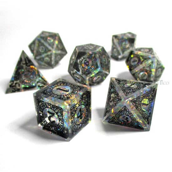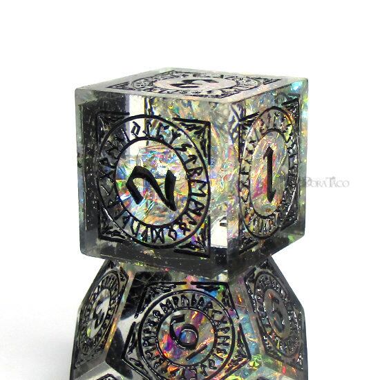 ケルト文字と内部に封入された七色の透明なフィルムが奇麗な多面体ダイスセットです。