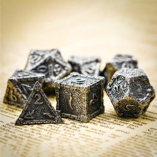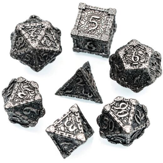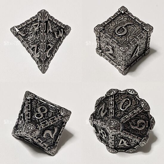 中世をイメージした本体デザインに毒塗りダガーをイメージした数字、縁までデザインされた金属製ダイスセットです。
