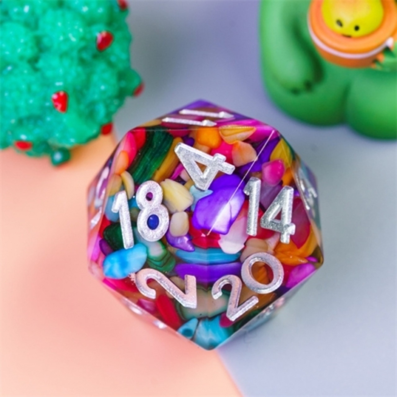 カラフルな色付き貝殻をギッシリ詰め込んだ多面体ダイスセット
