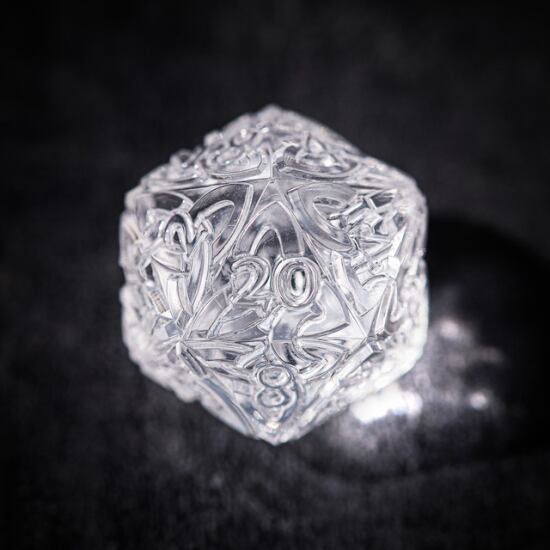ケルト模様の凹凸と光の演出が美しい、アクリル製20面ダイス。
