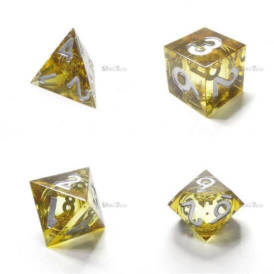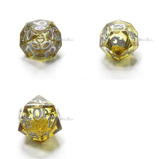 ラメ入り液体がサイコロの中に入った多面体ダイスセットです。