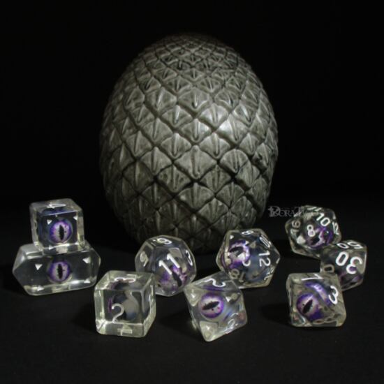 特許技術を使用し、サイコロ内部にドラゴンの眼球を入れ眼球が前を向くように配置したダイスセットです。