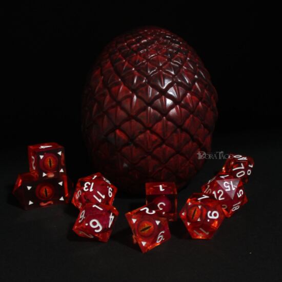 特許技術を使用し、サイコロ内部にドラゴンの眼球を入れ眼球が前を向くように配置したダイスセットです。