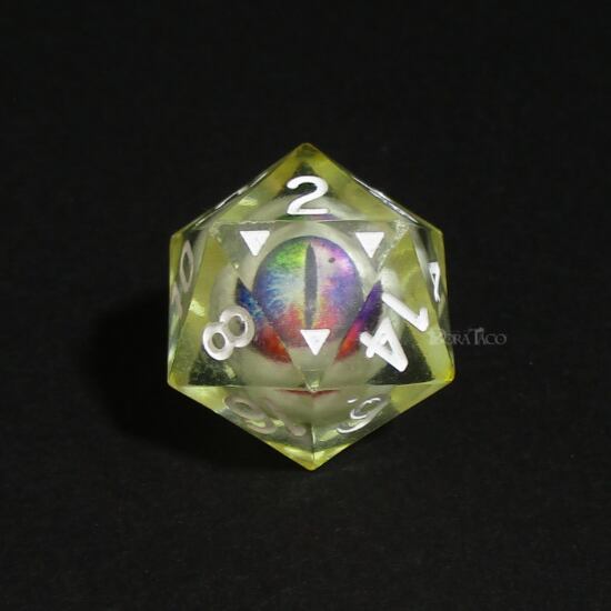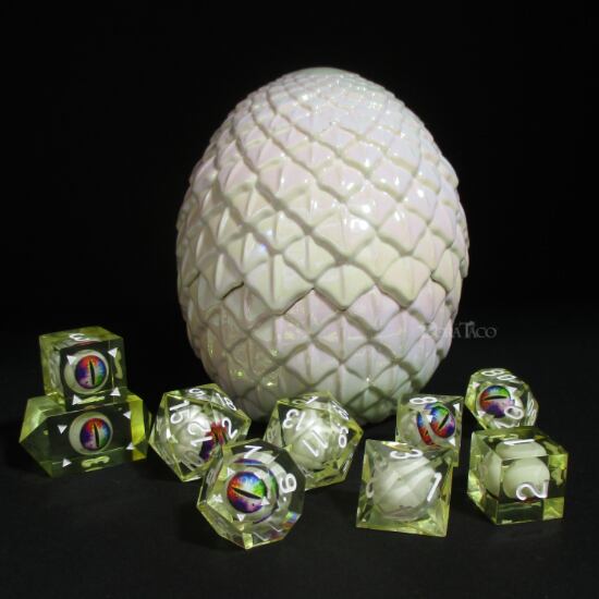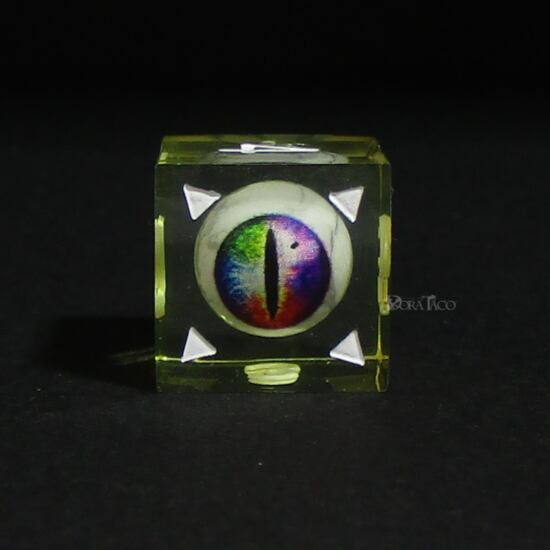 特許技術を使用し、サイコロ内部にドラゴンの眼球を入れ眼球が前を向くように配置したダイスセットです。